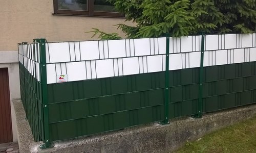 Doppelstabmatten leicht feuerverzinkt und grün beschichtet mit Pfosten 60 x 40 mit Abdeckleistenmit Fussplatte |