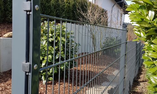 Doppelstabmatten schwer feuerverzinkt und anthrazit beschichtet mit Pfosten 60 x 40 mit Abdeckleisten einbetoniert |