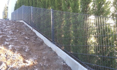Fence type: | Doppelstabmatten schwer feuerverzinkt und anthrazit beschichtet mit Pfosten 60 x 40 mit Abdeckleisten einbetoniert |