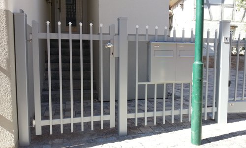 Tür mit Zaunfeld und eingebauten Doppelbriefkasten