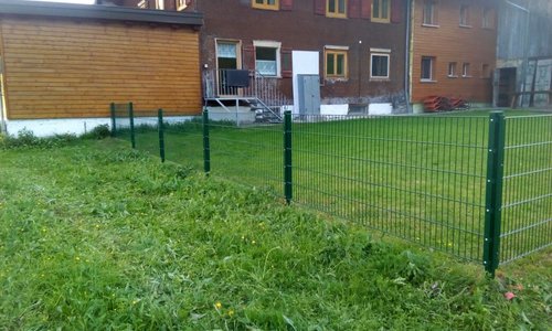 Doppelstabmatten schwer feuerverzinkt und grün beschichtet mit Pfosten 60 x 40 mit Abdeckleisten einbetoniert |