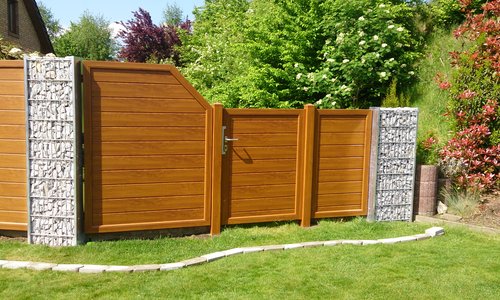 Sichtschutzzaun mit Gehtür, Farbe "Golden Oak" zwischen Gabionensäulen montiert