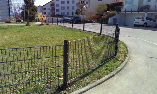Doppelstabmatten schwer feuerverzinkt und anthrazit beschichtet mit Pfosten 60 x 40 mit Abdeckleisten einbetoniert |