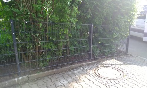 Doppelstabmatten schwer feuerverzinkt und anthrazit beschichtet mit Pfosten 60 x 40 mit Abdeckleisten einbetoniert |