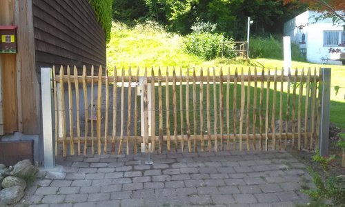 Zweiflügeliges Tor , Rahmen aus Vierkantrohr, belattet mit aufgeschraubten Zaunriegeln und Naturzaun aus Kastanienholz