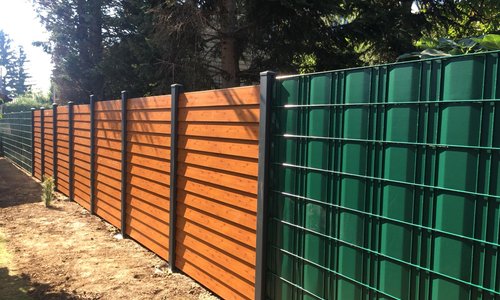 Stabiles Alu Sichtschutzsystem, Alu-Pfosten in der edlen Farbe Anthrazit und die Querlatten in Alu-Holzoptik. Mit der leichten Abschrägung wurde der Sichtschutz etwas aufgelockert. Rechts und Links vom Alu Sichtschutz, wurde ein Doppelstabmattenzaun in Moosgrün verbaut mit PVC Sichtschutzstreifen.