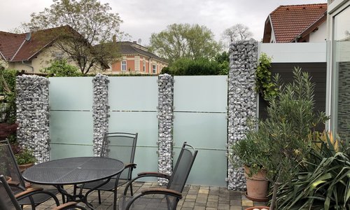 Sichtschutz aus Gabionensäulen mit satiniertem Glas in 3 Teilen zur Auflockerung