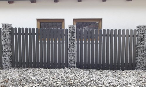 Alu-Lattenzaun an Gabionenpfosten ( gefüllte Gabionenkörbe )