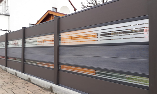 Sehr eleganter WPC SIchtschutzzaun mit Glas Zwischenelementen.