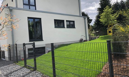 Doppelstabmatten leicht vorverzinkt und anthrazit beschichtet mit Pfosten 60 x 40 mit Abdeckleisten einbetoniert |