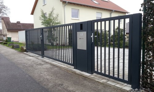 Schlicht und Elegant kombiniert diese Aluminiumvariante. Doppelflügeltor und Gehtüre mit integrierter Mediensäule und Postkasten.