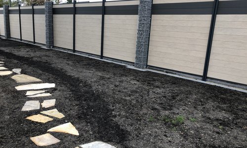 Kombination aus Gabionensäulen und WPC Sichtschutz ( Sand/ Anthrazit)