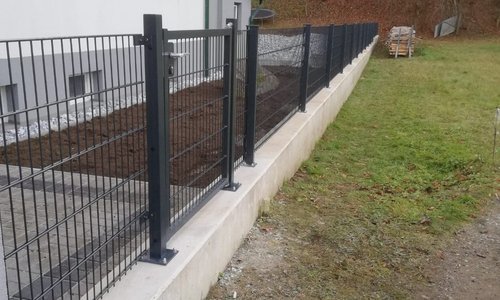 Doppelstabmatten schwer vorverzinkt und anthrazit beschichtet mit Pfosten 40x60 mit Abdeckleistenmit Fussplatte |