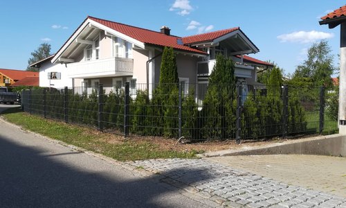 Doppelstabmatten schwer feuerverzinkt und anthrazit beschichtet mit Pfosten 60 x 40 mit Abdeckleisten einbetoniert |