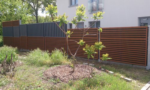 Schallschutzzaun in unterschiedlichen Höhen, Farben und Elementen, eine schöne Kombination auf Kundenwunsch