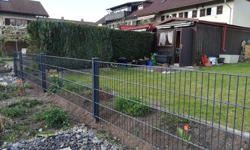 Doppelstabmatten schwer feuerverzinkt und anthrazit beschichtet mit Pfosten 60 x 40 mit Abdeckleisten einbetoniert |