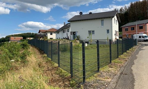 Doppelstabmatten leicht vorverzinkt und anthrazit beschichtet mit Pfosten 60 x 40 mit Abdeckleisten einbetoniert |