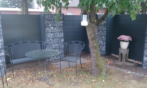 Gabionen 40 cm breit, Füllung mit Alpensteinen, Farbe anthrazit, in Kombination mit Alu-Sichtschutzzaun