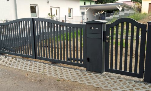 2-flg Toranlage mit Gehtüre und Mediensäule.