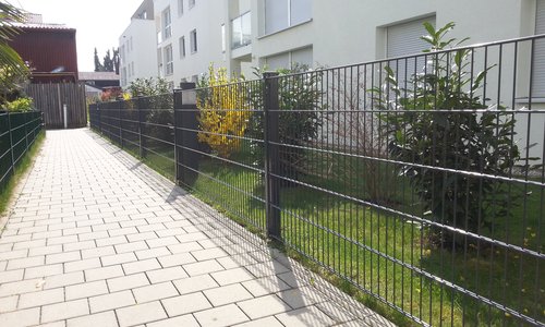 Doppelstabmatten schwer feuerverzinkt und anthrazit beschichtet mit Pfosten 60 x 40 mit Abdeckleisten einbetoniert |