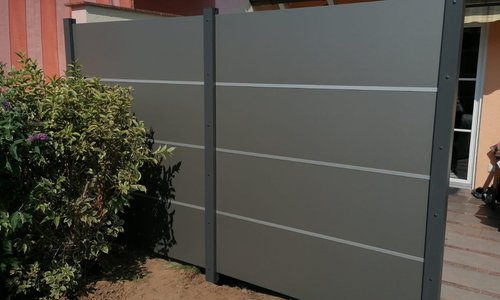 HPL Sichtschutz Typ 1.2 Steingrau und Mint mit Aluminiumpfosten vierkant in Bodenhülse |