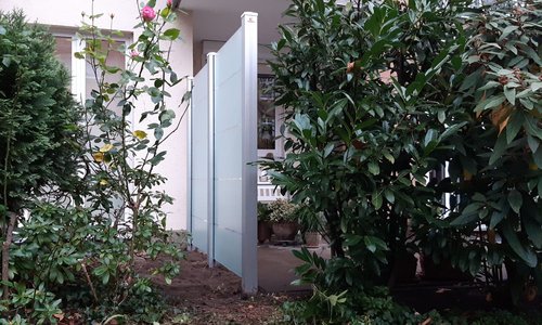 Terrassenabtrennung aus Glas, satiniert, mit eloxierten Aluminiumpfosten