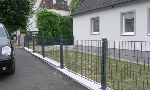 Doppelstabmatten schwer feuerverzinkt und anthrazit beschichtet mit Pfosten 60 x 40 mit Abdeckleistenmit Fussplatte |