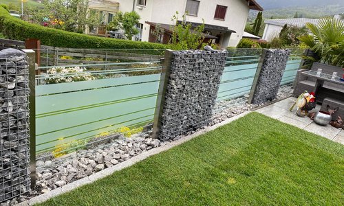Glas Sichtschutz mit vierkant Edelstahlpfosten einbetoniert |