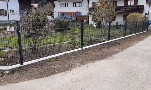 Doppelstabmatten schwer feuerverzinkt und anthrazit beschichtet mit Pfosten 60 x 40 mit Abdeckleisten einbetoniert |