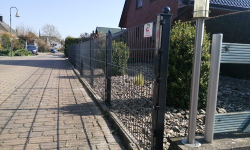 Doppelstabmatten leicht feuerverzinkt und anthrazit beschichtet mit Pfosten 60 x 40 mit Abdeckleisten einbetoniert |