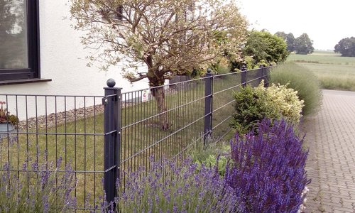 Doppelstabmatten leicht feuerverzinkt und anthrazit beschichtet mit Pfosten 60 x 40 mit Abdeckleisten einbetoniert |