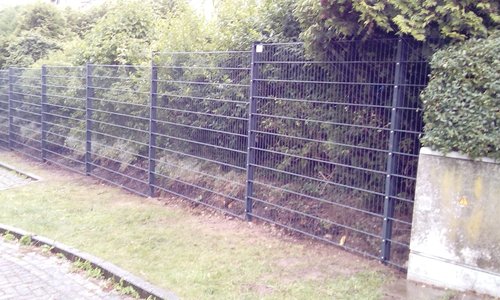 Doppelstabmatten schwer feuerverzinkt und anthrazit beschichtet mit Pfosten 60 x 40 mit Abdeckleisten einbetoniert |