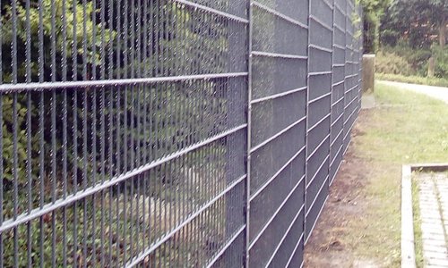 Doppelstabmatten leicht feuerverzinkt und anthrazit beschichtet mit Pfosten 60 x 40 mit Abdeckleisten einbetoniert |
