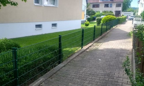 Doppelstabmatten schwer feuerverzinkt und grün beschichtet mit Pfosten 60 x 40 mit Abdeckleisten einbetoniert |