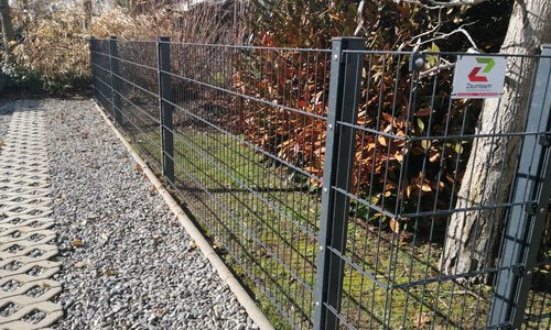 Doppelstabmatten leicht feuerverzinkt und anthrazit beschichtet mit Pfosten 60 x 40 mit Abdeckleisten einbetoniert |