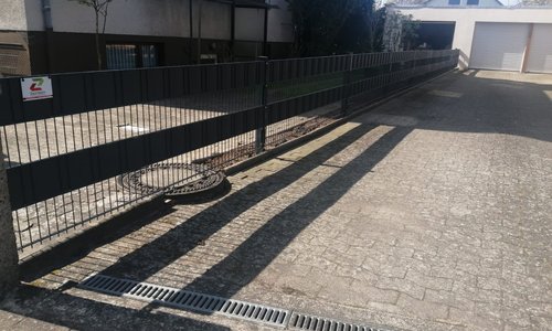 Doppelstabmatten schwer feuerverzinkt und anthrazit beschichtet mit Pfosten 60 x 40 mit Abdeckleisten einbetoniert |
