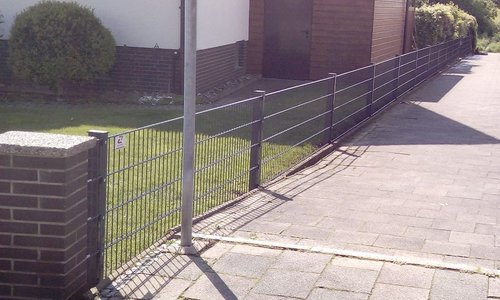 Doppelstabmatten leicht feuerverzinkt und anthrazit beschichtet mit Pfosten 60 x 40 mit Abdeckleisten einbetoniert |