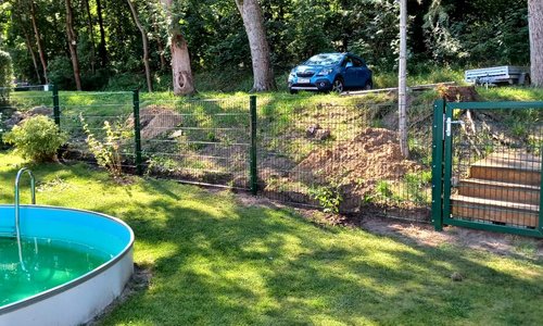Doppelstabmatten leicht vorverzinkt und grün beschichtet mit Pfosten 60 x 40 mit Abdeckleisten einbetoniert |