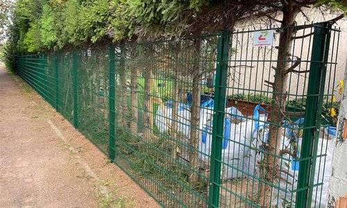 Doppelstabmatten schwer feuerverzinkt und grün beschichtet mit Pfosten 60 x 40 mit Abdeckleisten einbetoniert |