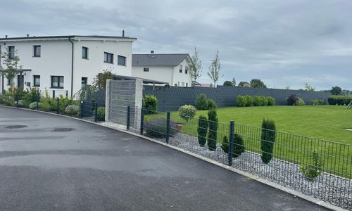 Doppelstabmatten schwer verzinkt mit Pfosten 40x60 verzinkt mit Abdeckleisten einbetoniert |
