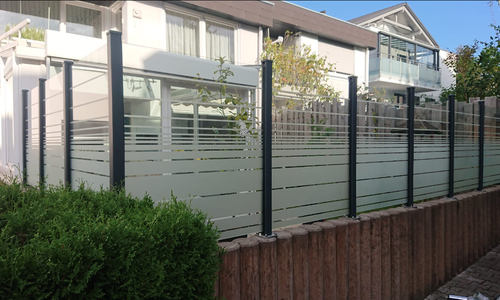 Glas Sichtschutz mit vierkant Aluminium-Nutpfosten mit Fussplatte |