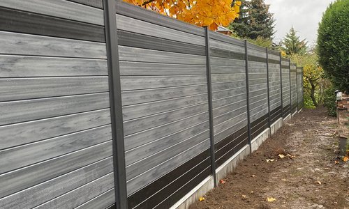 Lärmschutzwand, Farbe: Graphit grau und anthrazit in Kombination, Stahlpfosten feuerverzinkt und pulverbeschichtet Elegance Graphit