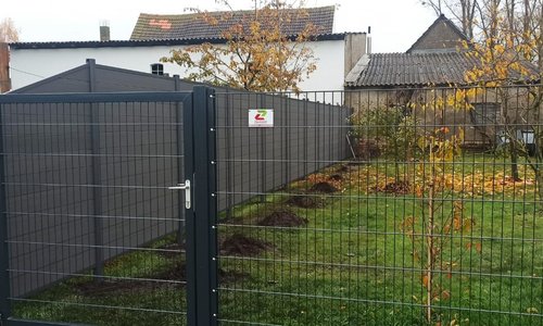 Doppelstabmatten leicht vorverzinkt und anthrazit beschichtet mit Pfosten 60 x 40 mit Abdeckleisten einbetoniert |