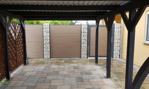 WPC Sichtschutzzaun in Kombination mit Gabionensäulen