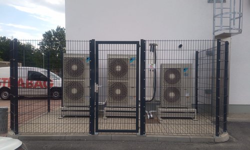 Doppelstabmatten leicht vorverzinkt und anthrazit beschichtet mit Pfosten Vario mit Fussplatte |