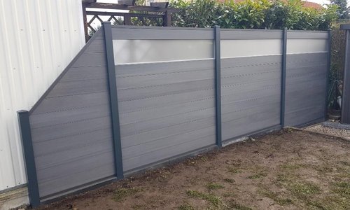 WPC Sichtschutzzaun, Farbe: Platinum grau, Leisten und Pfosten in Anthrazit in Kombination mit Dekorprofil Mattglas.