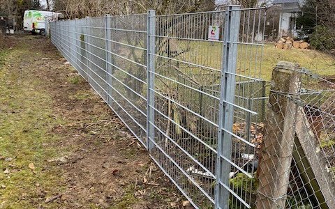 Doppelstabmatten schwer verzinkt mit Pfosten 40x60 verzinkt mit Abdeckleisten einbetoniert |