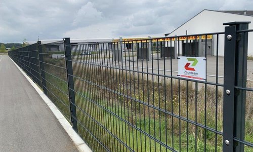 Doppelstabmatten schwer feuerverzinkt und anthrazit beschichtet mit Pfosten 60 x 40 mit Abdeckleisten einbetoniert |
