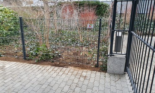 Doppelstabmatten leicht vorverzinkt und anthrazit beschichtet mit Pfosten 60 x 40 mit Abdeckleisten einbetoniert |