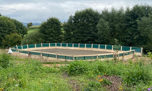Paddock aus gerammten Robinienpfosten, Belattung mit Kiefernholz und Windschutznetz